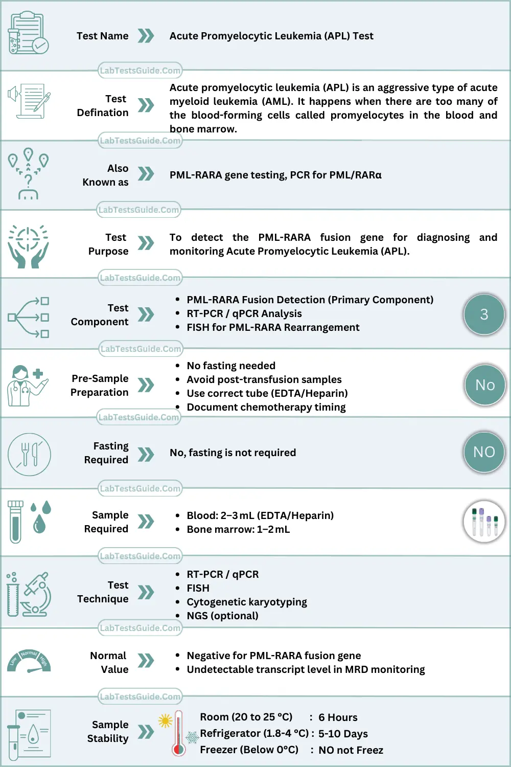 The Acute Promyelocytic Leukemia (APL) Test identifies the PML-RARA fusion gene through PCR, FISH, or cytogenetics for rapid diagnosis of APL. Learn about indications, sample requirements, procedure, reference ranges, and interpretation for accurate clinical decision-making.