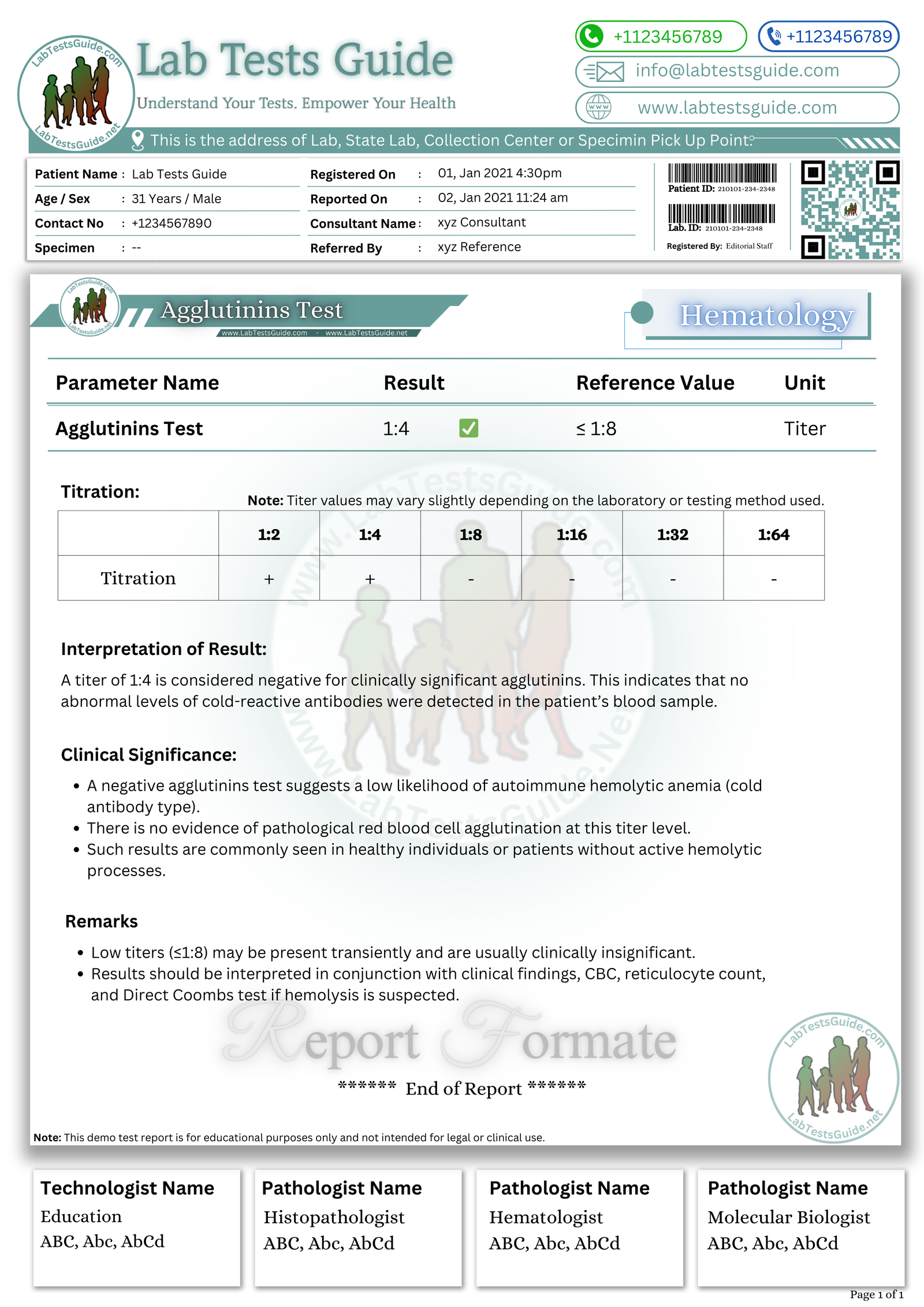 Negative Agglutinins Test Demo Report Format in (PDF) |